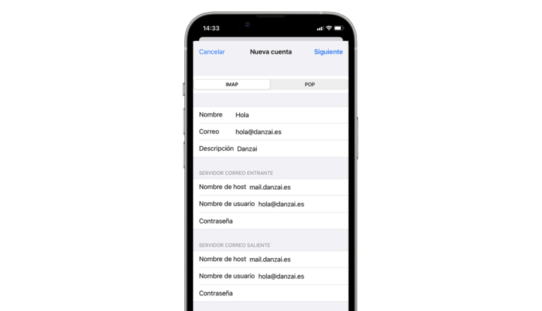 7. Esta parte es donde tenéis que poner toda la configuración de la cuenta. Los datos del servidor entrante y saliente, también tenemos que marcar si va a ser IMAP o POP, nosotros recomendamos que para dispositivos móviles de no mucha capacidad utilizáis IMAP, ya que de esta forma no guarda los correos en el dispositivo, sino que los consulta desde el servidor.
